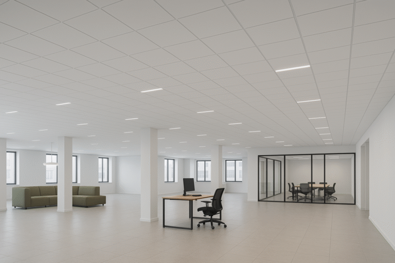Grid ceilings offer a clean, organized, and efficient solution for modern industrial and commercial spaces. Designed with a metal framework and lightweight ceiling tiles, they conceal all electrical wiring, ducts, and utilities while providing easy access for maintenance. The tiles are available in moisture-resistant and acoustic options, improving sound control and lighting reflection. Grid ceilings enhance aesthetics, reduce noise, and create a professional environment — making them ideal for offices, factories, and retail showrooms.